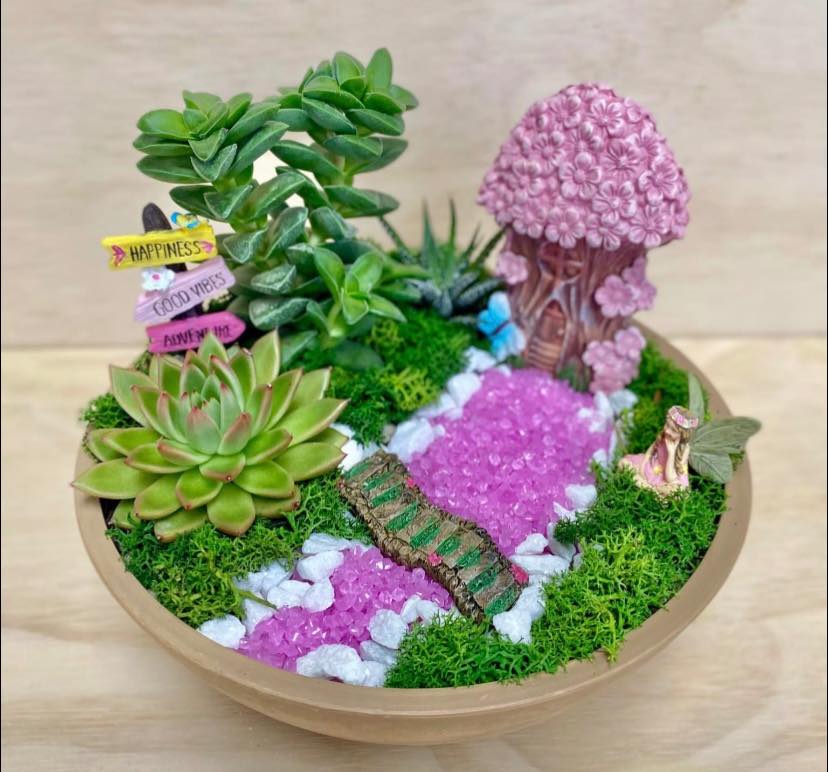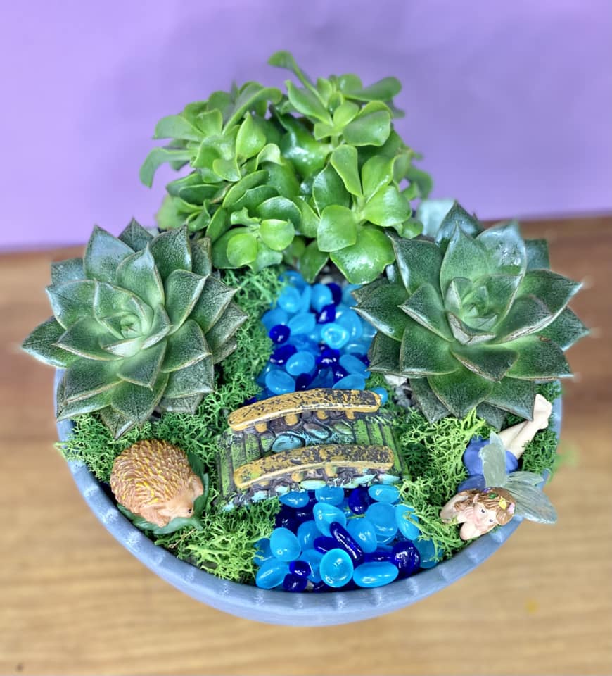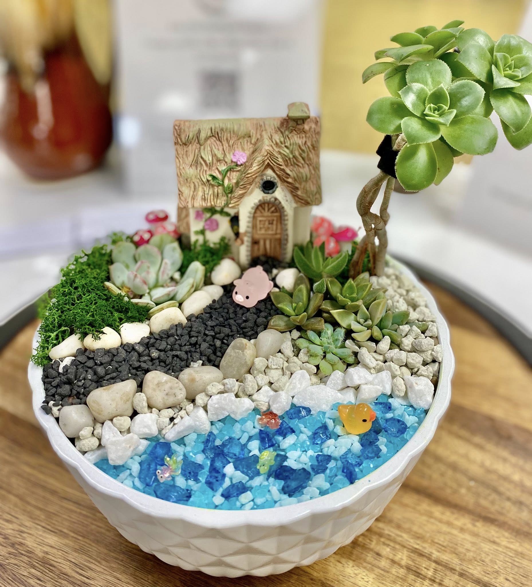 Next comes the fun part—choosing your pieces. You’ll select your pot, decorative figurines and structures, and then hand-pick the perfect succulents for your arrangement or miniature landscape.