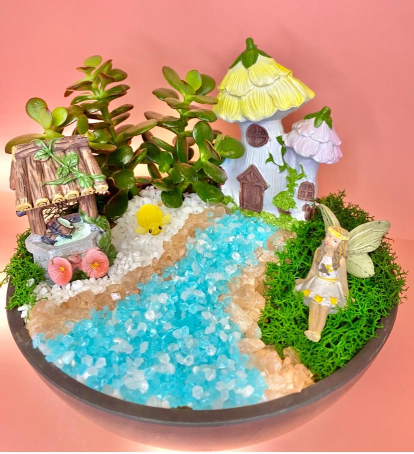 Includes planting help, soil, and decorative toppings: rocks, moss, sand, glass and glow in the dark beads
